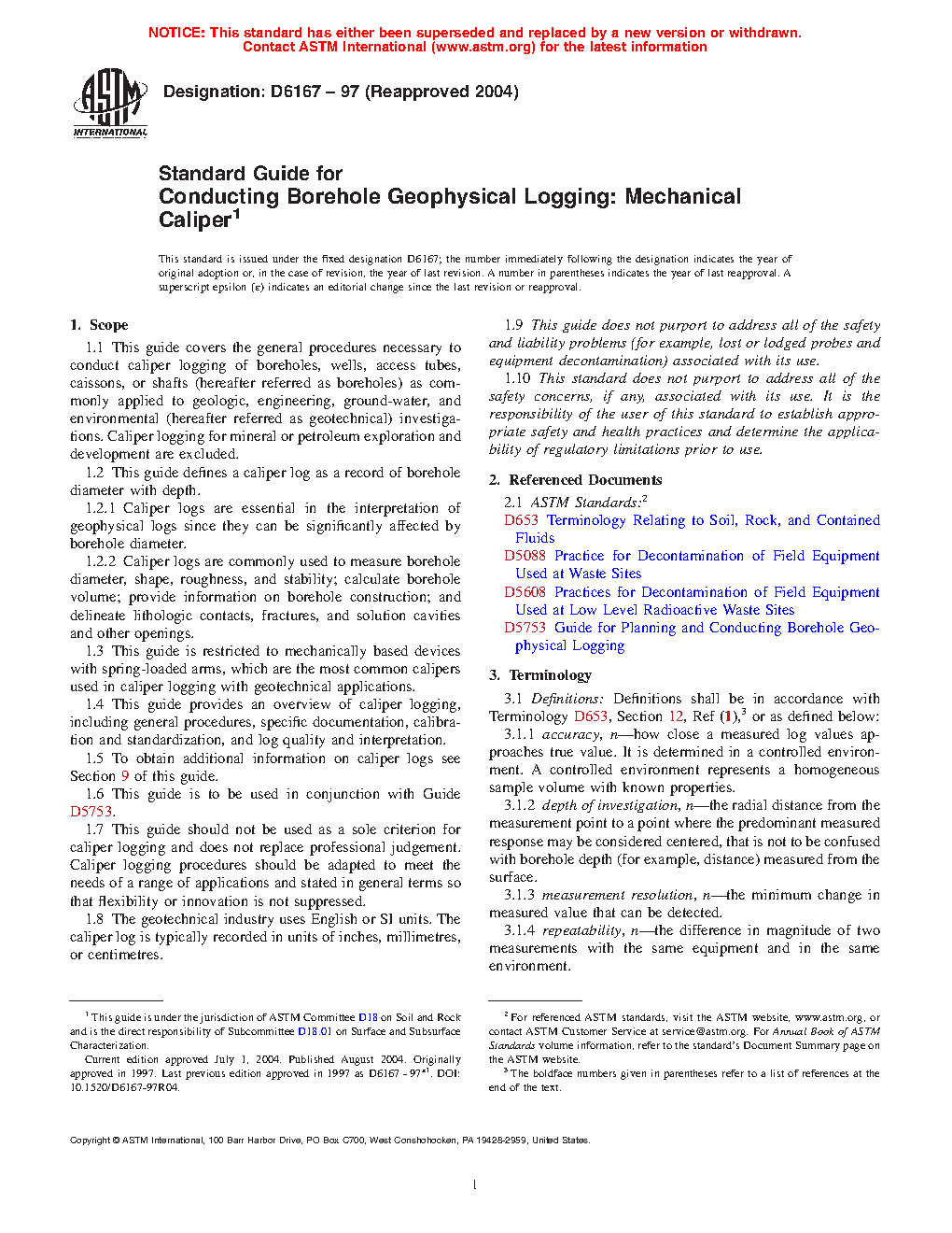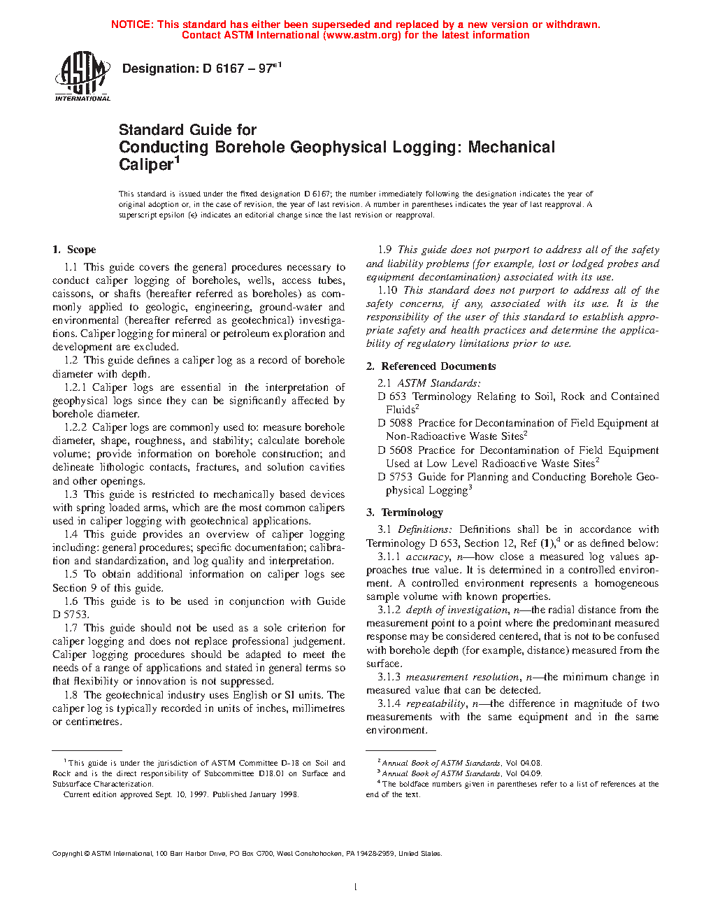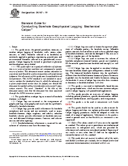 1.1 This guide covers the general procedures necessary to conduct caliper logging of boreholes, wells, access tubes, caissons, or shafts (hereafter referred to as boreholes) as commonly applied to geologic, engineering, groundwater, and environmental (hereafter referred to as geotechnical) investigations. Caliper logging for mineral or petroleum exploration and development are excluded.