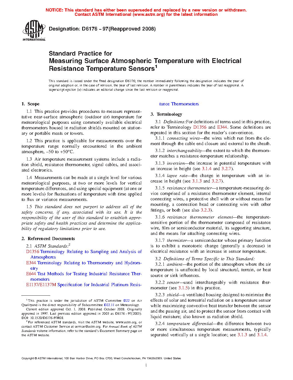 1.1 This practice provides procedures to measure representative near-surface atmospheric (outdoor air) temperature for meteorological purposes using commonly available electrical thermometers housed in radiation shields mounted on stationary or portable masts or towers.