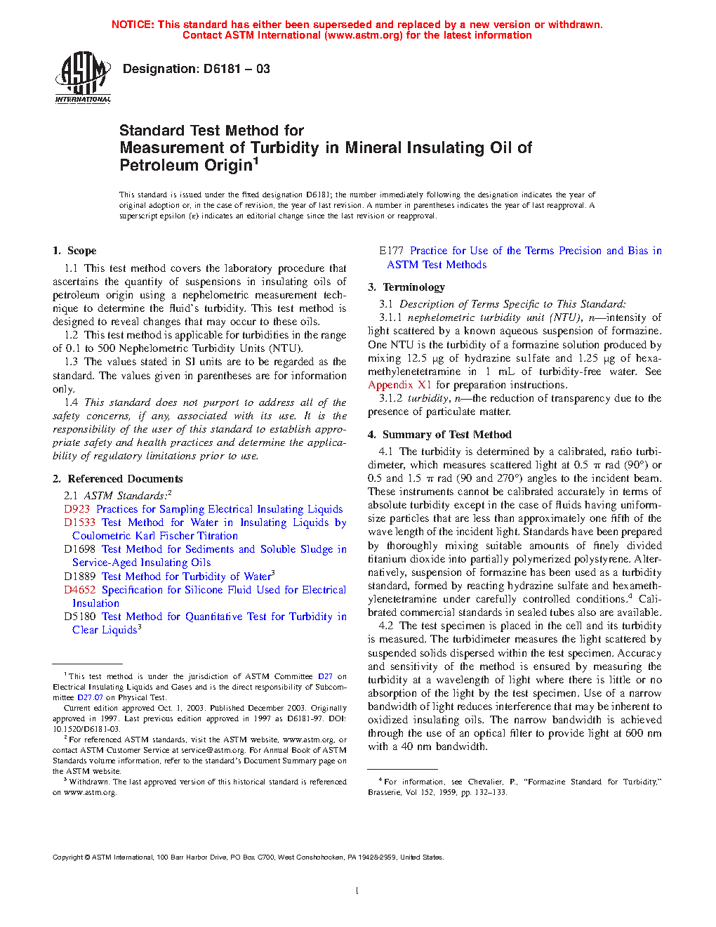 1.1 This test method covers the laboratory procedure that ascertains the quantity of suspensions in insulating oils of petroleum origin using a nephelometric measurement technique to determine the fluid's turbidity. This test method is designed to reveal changes that may occur to these oils.