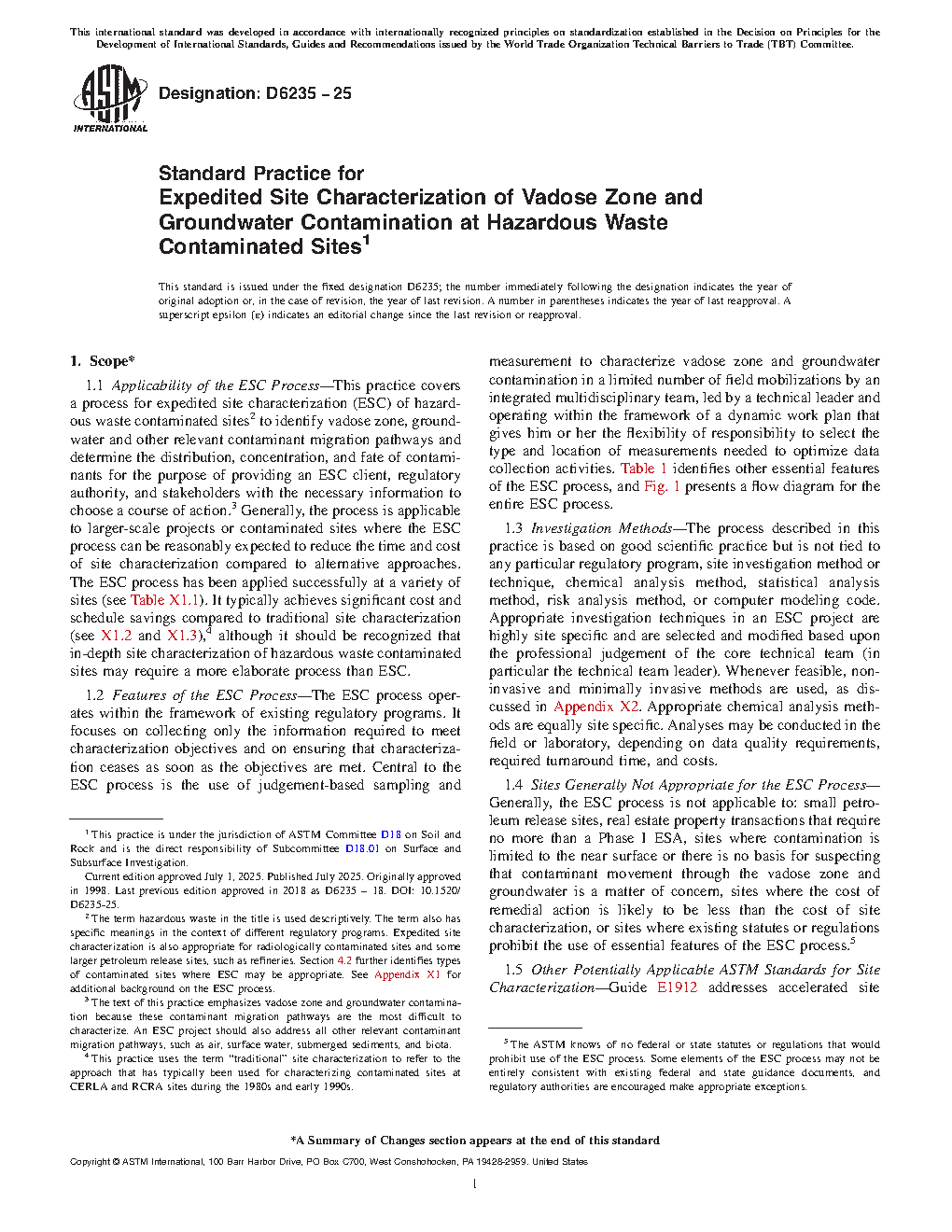4.6 Use of ESC in Conjunction with Other Methods—This practice can be used in conjunction with Guide D5730 for identification of potentially applicable ASTM standards and major non-ASTM guidance. In karst and fractured rock hydrogeologic settings, this practice can be used in conjunction with Guide D5717.