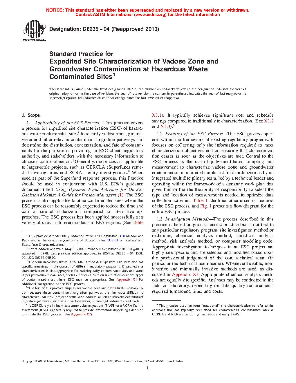 4.5 Flexibility Within ESC—Modification of procedures described in this practice may be appropriate if required to satisfy project objectives or regulatory requirements, or for other reasons. The ESC process is flexible enough to accommodate a variety of different technical approaches to obtaining environmental data. However, for an investigation to qualify as an ESC project, as formalized by ASTM, modifications should not eliminate any of the essential features of the ESC process listed in Table 1. Alternative site characterization approaches that use some, but not all, of the essential elements described in Table 1 may be appropriate for a site, but these approaches would not qualify as an ESC project as defined in this practice.