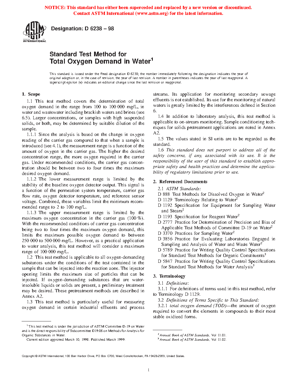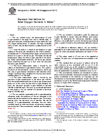 1.1 This test method covers the determination of total oxygen demand in the range from 100 mg/L to 100 000 mg/L, in water and wastewater including brackish waters and brines (see 6.5). Larger concentrations, or samples with high suspended solids, or both, may be determined by suitable dilution of the sample.