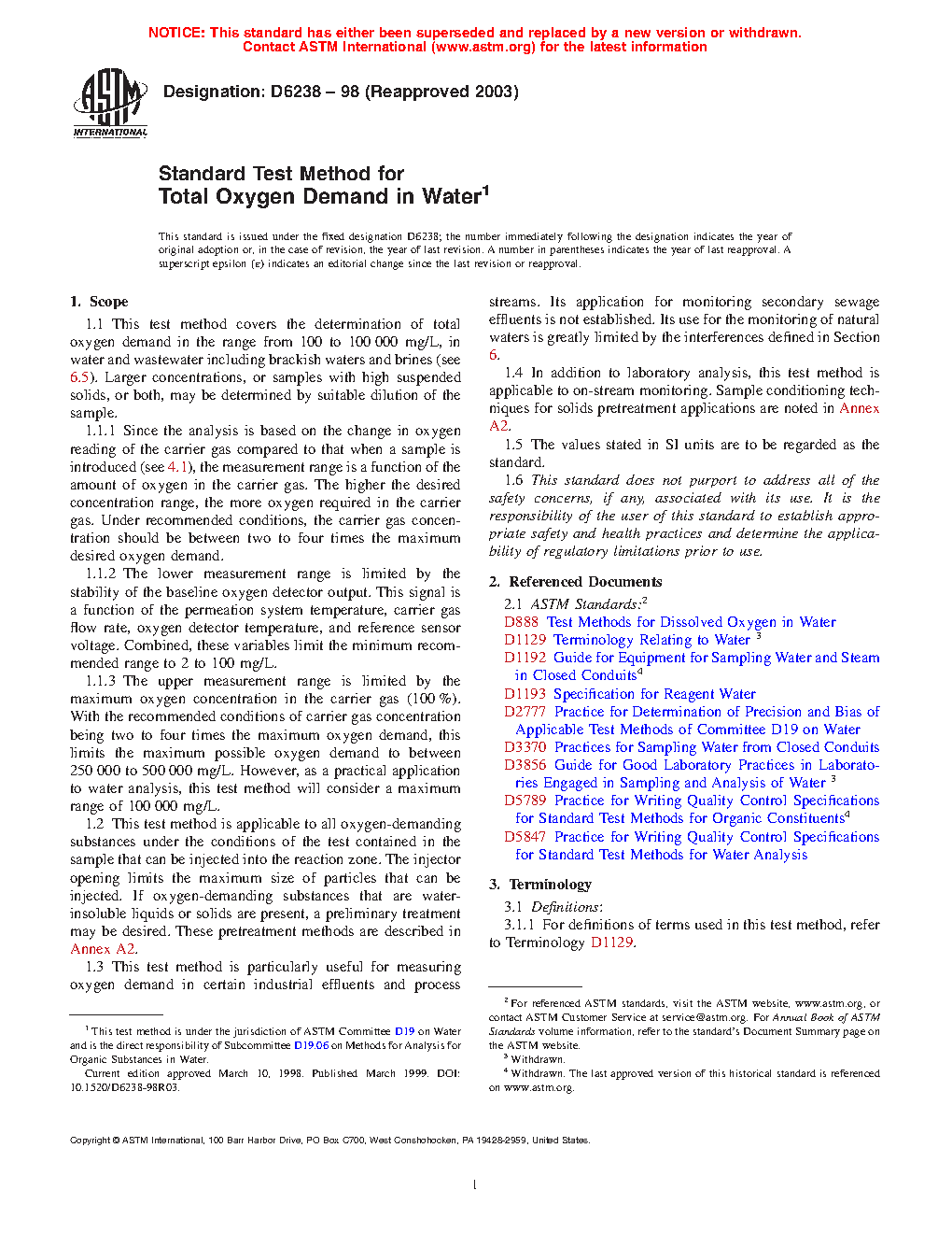 1.2 This test method is applicable to all oxygen-demanding substances under the conditions of the test contained in the sample that can be injected into the reaction zone. The injector opening limits the maximum size of particles that can be injected. If oxygen-demanding substances that are water-insoluble liquids or solids are present, a preliminary treatment may be desired. These pretreatment methods are described in Annex A2.