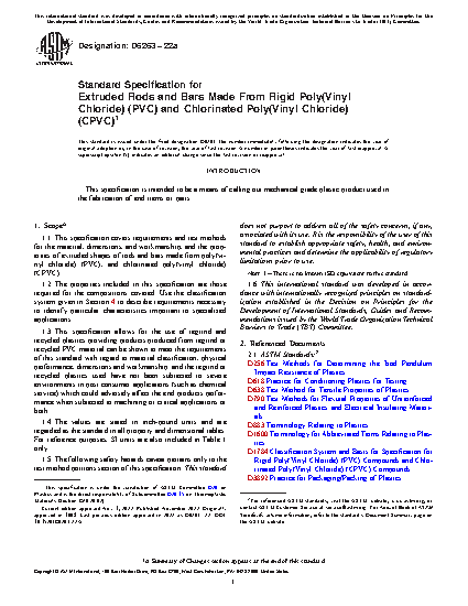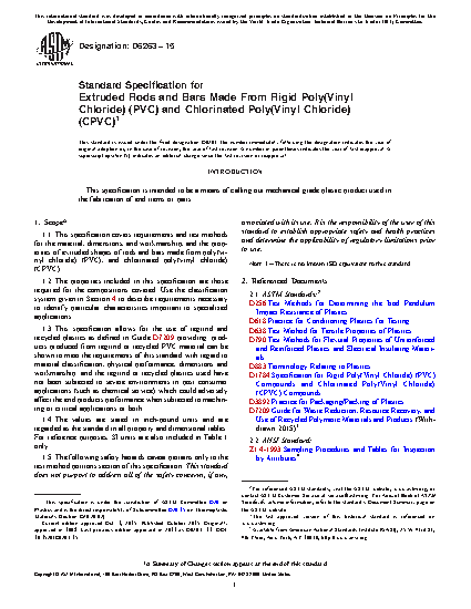 This specification covers requirements and test methods for the material, dimensions, and workmanship, and the properties of extruded shapes of rods and bars made from poly(vinyl chloride) (PVC), and chlorinated poly(vinyl chloride) (CPVC). The type of poly(vinyl chloride), and chlorinated poly(vinyl chloride) shape product may be categorized by type, grade, and class depending on resin composition: Types 01 and 02; Classes 0 and 1; Grades 0 and 1. The type, class and grade is further differentiated based on dimensional stability. The following test methods shall be performed: tensile stress at break; elongation at break; tensile modulus; dimensional stability; lengthwise chamber; flexural modulus; izod impact; and degree of fusion of extruded PVC and CPVC by solvent immersion.