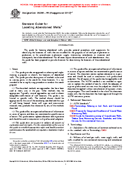1.2 The described methods are approaches that have been used at many sites in the past. Other methods may be appropriate. Typically, several approaches are used to obtain acceptable confirmation of well locations. This guide is not limited to specific wells. The method chosen should be appropriate for the size of the area being searched and the type of well being located. Some well types and construction materials may preclude their detection by any of the methods described.