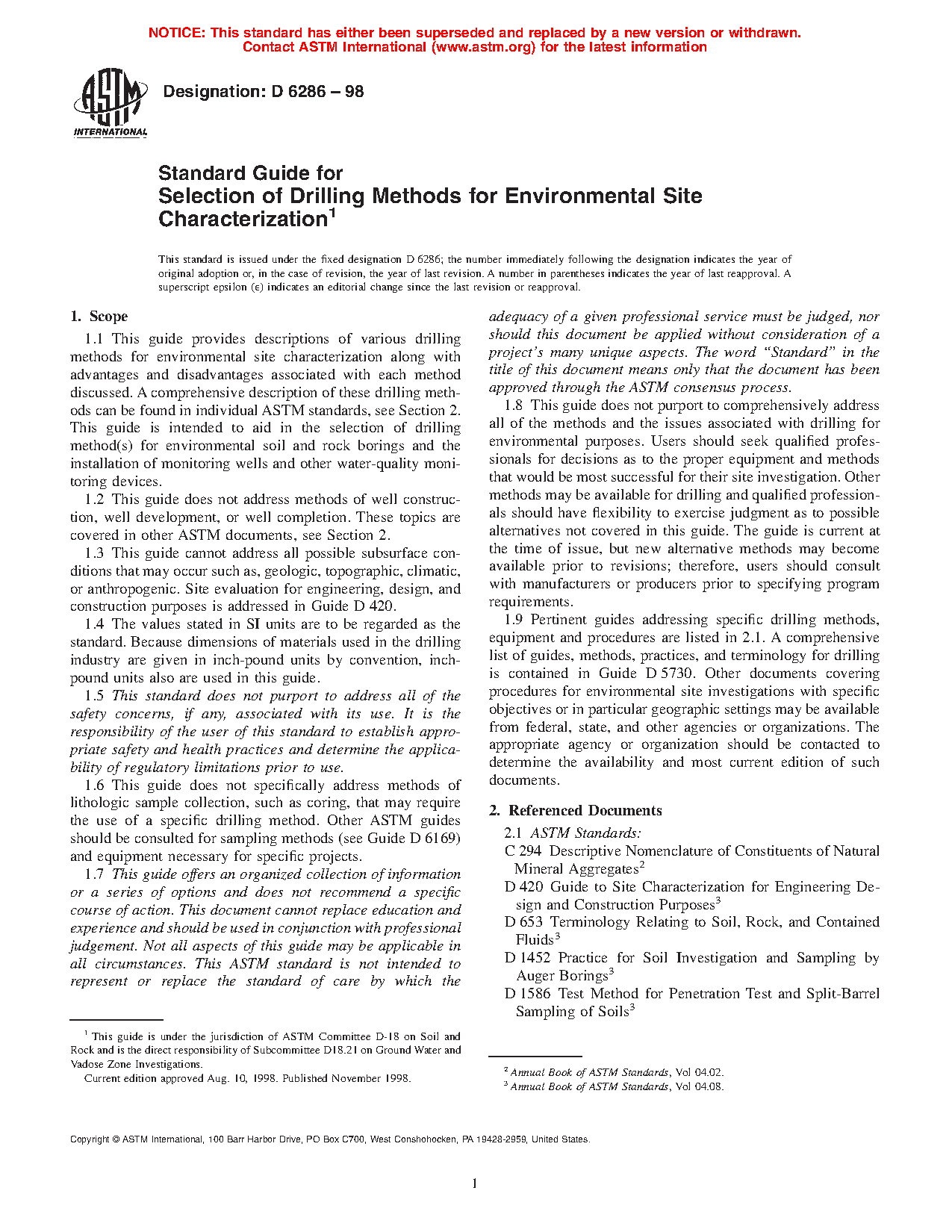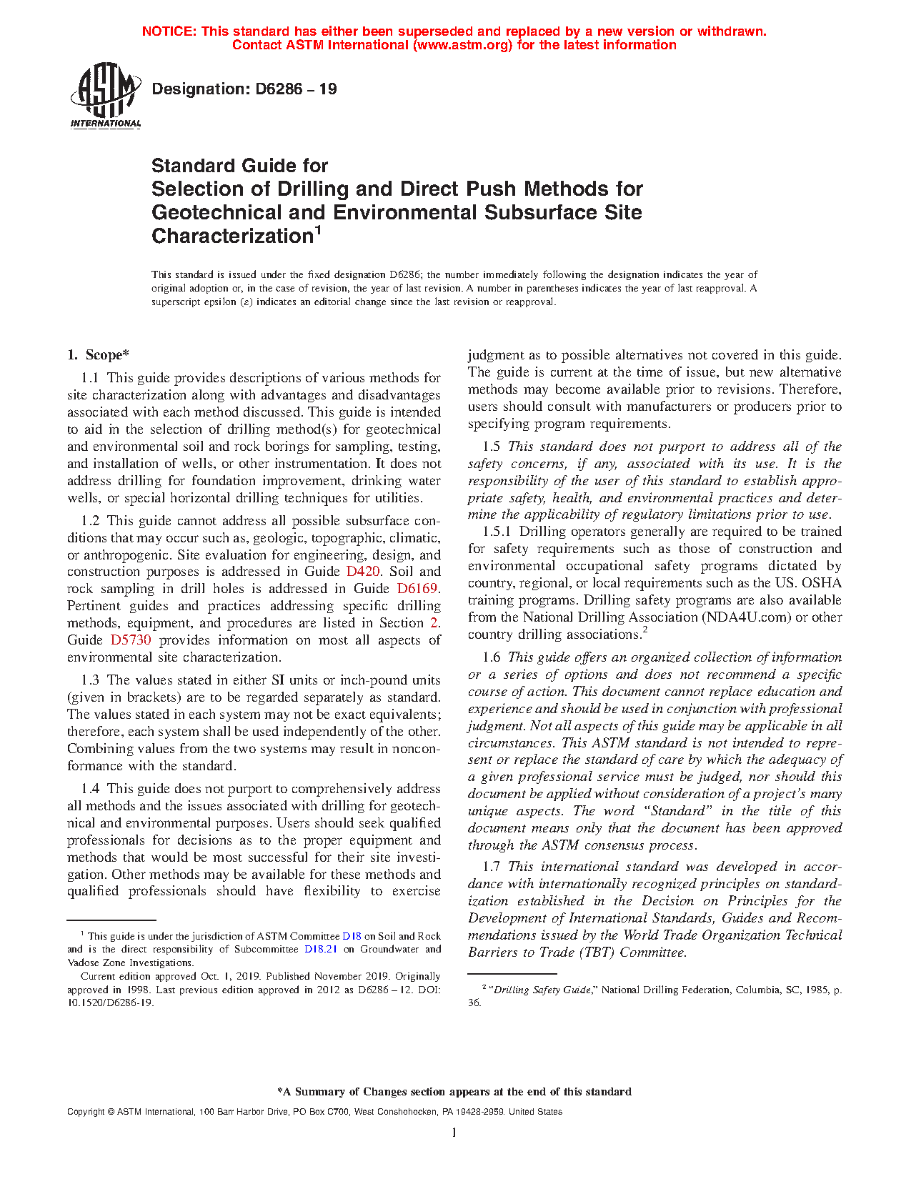 1.1 This guide provides descriptions of various drilling methods for environmental site characterization along with advantages and disadvantages associated with each method discussed. A comprehensive description of these drilling methods can be found in individual ASTM standards, see Section 2. This guide is intended to aid in the selection of drilling method(s) for environmental soil and rock borings and the installation of monitoring wells and other water-quality monitoring devices.