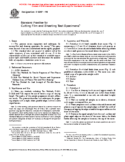 1.1 This practice covers equipment and techniques for cutting film and sheeting specimens for testing.2 The specimens are nick-free, non-stretched and can be rapidly prepared.