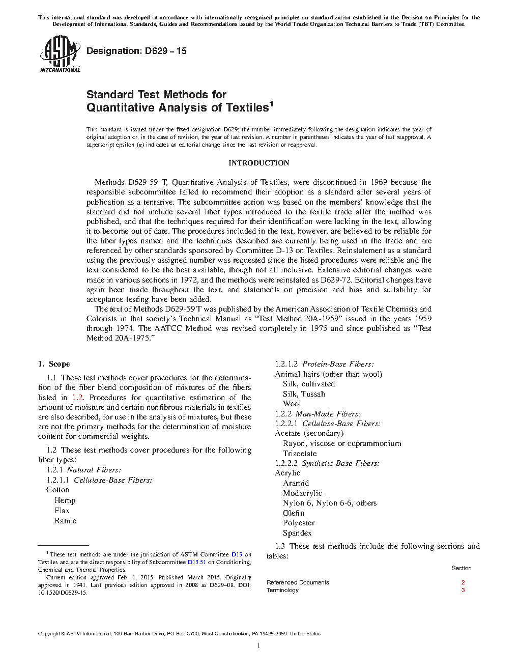 Section Referenced Documents 2 Terminology 3 Summary of Methods 4 Uses and Significance 5 Sampling 6 Purity of Reagents 7 Moisture Content or Moisture Regain 8 Nonfibrous Materials 9 Mechanical Separation or Dissection 10 Chemical Test Methods: Summary of Methods 11 Specimens and Symbols 12 No. 1 Acetate Mixed With Other Fibers 13 No. 2 Modacrylic Mixed With Cellulosic Fiber or Wool 14 No. 3 Nylon 6 or Nylon 6-6 Mixed With Natural Fibers or Rayon 15 No. 4 Rayon Mixed With Cotton 16 No. 5 Wool or Polyester Mixed With Cellulosic Fibers or Silk 17 No. 6 Polyester or Acrylic Mixed With Wool 18 No. 7 Natural Cellulosic Material and Rayon Mixed With Acrylic, Modacrylic, and Polyester 19 Referenced Documents 2 No. 8 Polyester Mixed With Olefin 20 No. 9 Polyester Mixed With Acetate or Nylon 6,6-6 21 No. 10 Acrylic Fiber or Linear Spandex Mixed With Nylon or Polyester 22 Microspical Analysis Scope 23 Summary of Method 24 Sampling 25 Apparatus 26 Procedure 27 Indexing Term 28 Table Chemical Methods for Analysis of Fiber Mixtures 1 Solubilities of Various Fibers in Solvents Used in Chemical Methods 2 Comparative Scale for Fineness of Various Textile Fibers 3 Fineness Ranges and Fiber Diameters of Various Textile Fibers 4 Specific Gravity of Various Textile Fibers 51.4 The analytical procedures described in the test methods are applicable to the fibers listed in 1.2. The test methods are not satisfactory for the separation of mixtures containing fibers that fall within the same generic class but differ somewhat, either physically or chemically, from each other. These test methods are not satisfactory for the determination of bicomponent fibers.