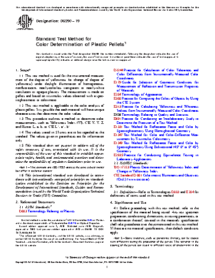 1.3 This procedure outlines a method to determine color measurements, such as Yellowness Index (YI), CIE X, Y, Z, and Hunter L, a, b, or CIE L*, a*, b*.
