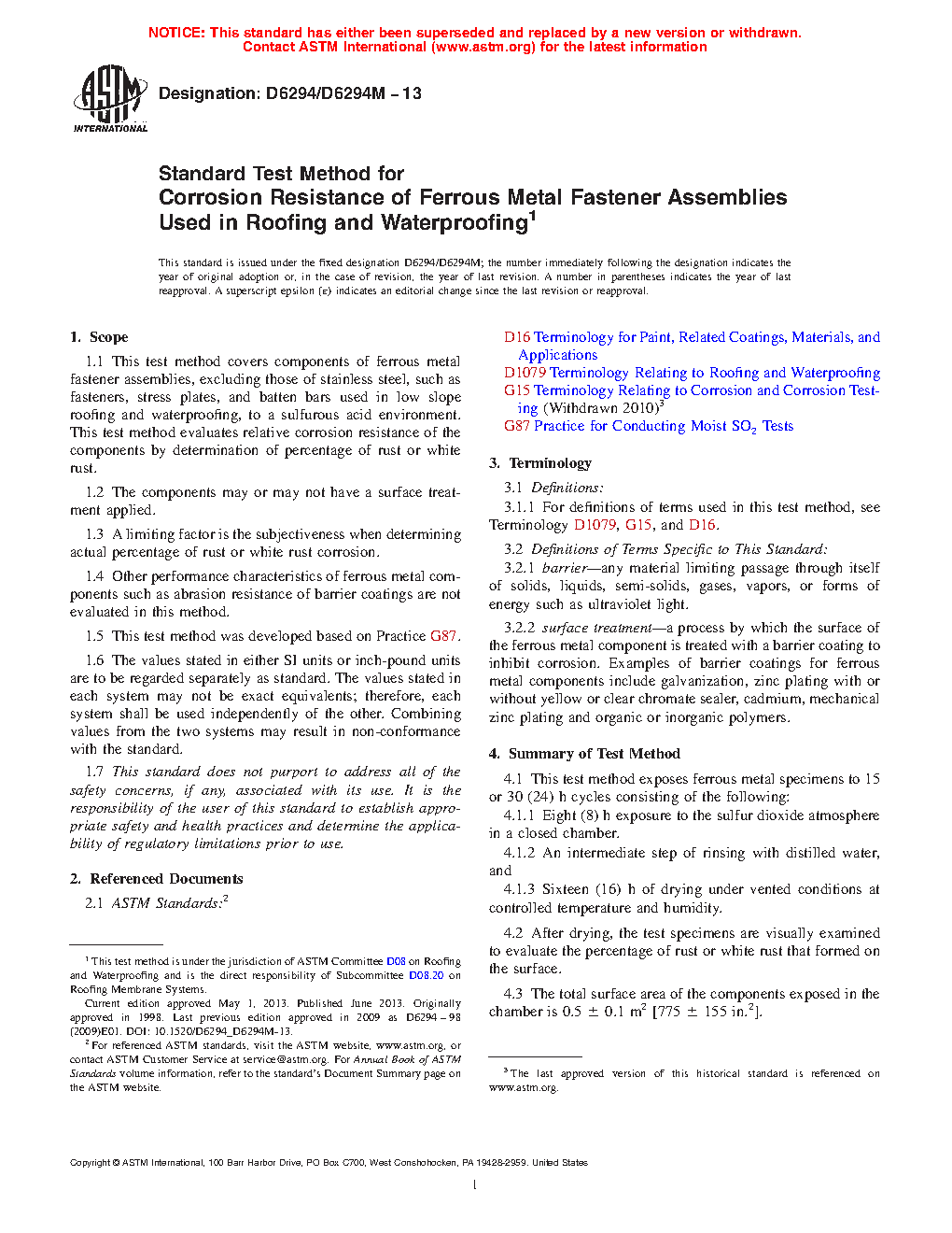It is important to evaluate the corrosion resistance of ferrous metal components used in low-slope roofing and waterproofing because they provide integrity and securement of other system components, such as insulation and membranes. Corrosion of ferrous metal components may result in their early deterioration and may lead to roofing or waterproofing system failure.