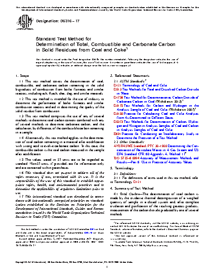 1.1 This test method covers the determination of total, combustible and carbonate carbon remaining in the solid byproducts of combustion from boiler furnaces and similar reactors, including ash, flyash, char, slag, and similar materials.