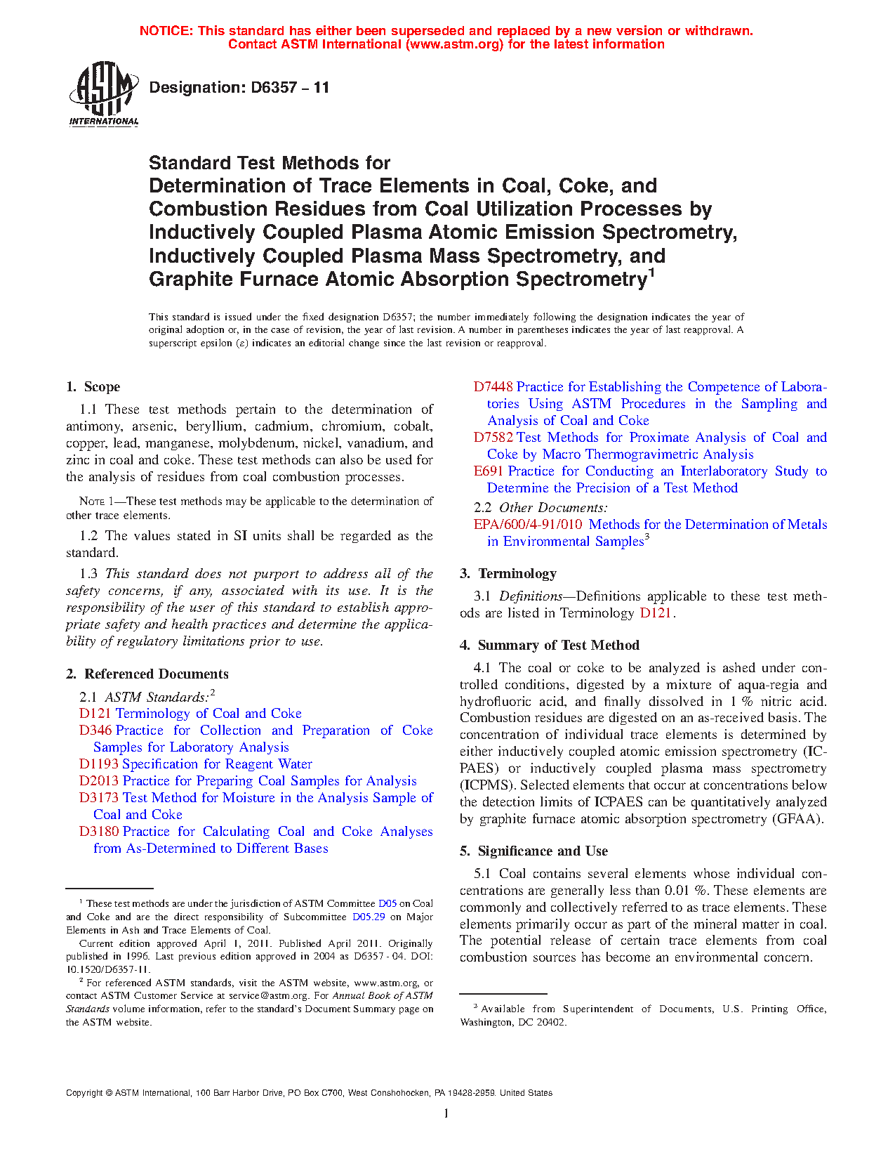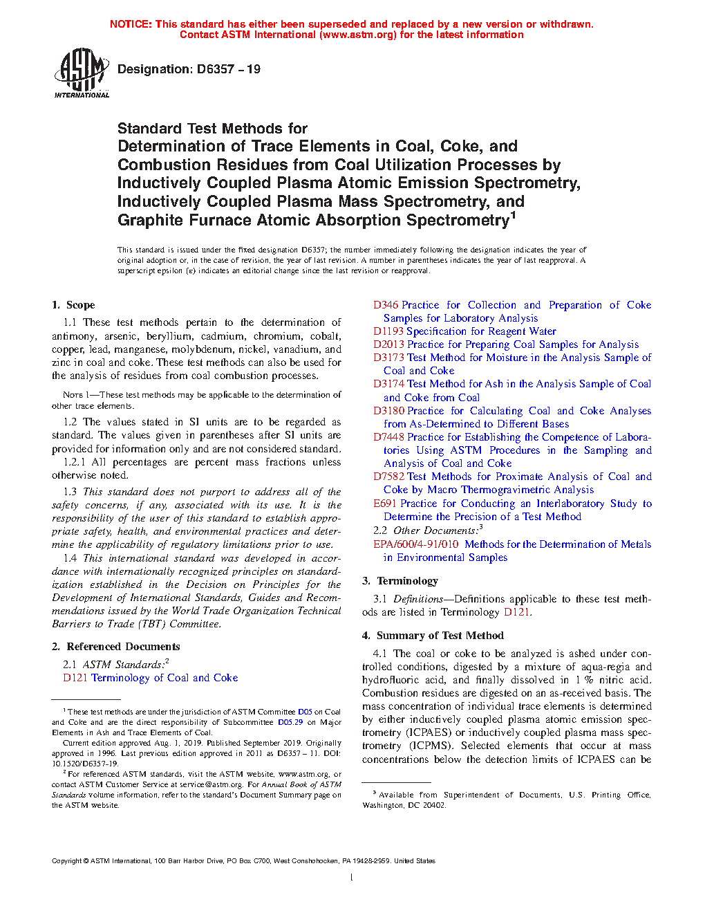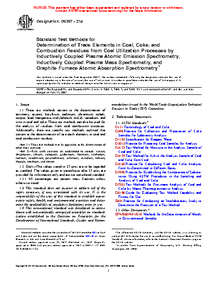 Test Methods for Determination of Trace Elements in Coal, Coke, & Combustion Residues from Coal Utilization Processes by Inductively Coupled Plasma Atomic Emission, Inductively Coupled Plasma Mass, & Graphite Furnace Atomic Absorption Spectrometry