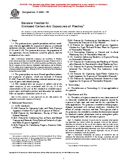 Note 1-Enclosed carbon-arc exposures are described in Practice G23, which described very specific equipment designs. Practice G23 is being replaced by Practice G151, which describes performance criteria for all exposure devices that use laboratory light sources, and by Practice G153, which gives requirements for exposing nonmetallic materials in enclosed carbon-arc devices. Practice G23 will be balloted for withdrawal before December 2000.