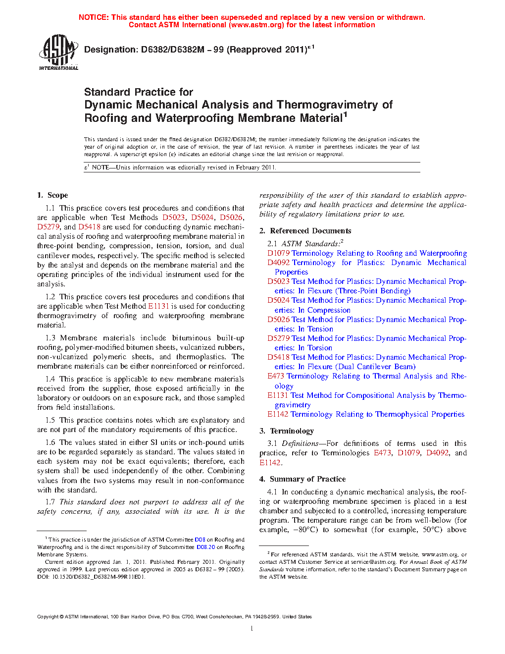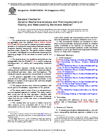 1.1 This practice covers test procedures and conditions that are applicable when Test Methods D5023, D5024, D5026, D5279, and D5418 are used for conducting dynamic mechanical analysis of roofing and waterproofing membrane material in three-point bending, compression, tension, torsion, and dual cantilever modes, respectively. The specific method is selected by the analyst and depends on the membrane material and the operating principles of the individual instrument used for the analysis.