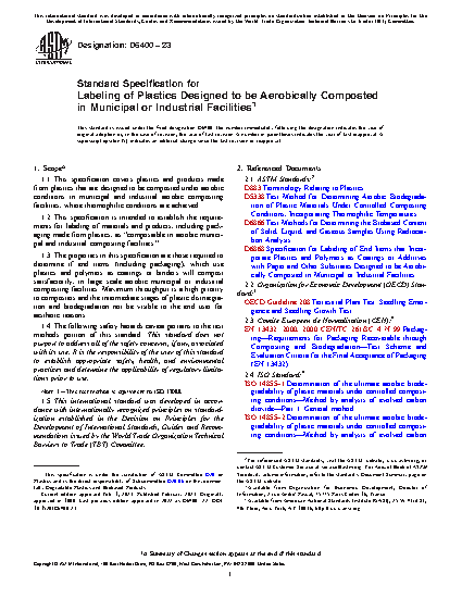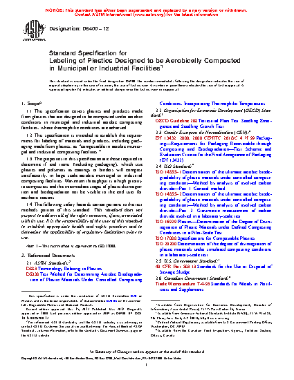 1.2 This specification is intended to establish the requirements for labeling of materials and products, including packaging made from plastics, as "compostable in municipal and industrial composting facilities."