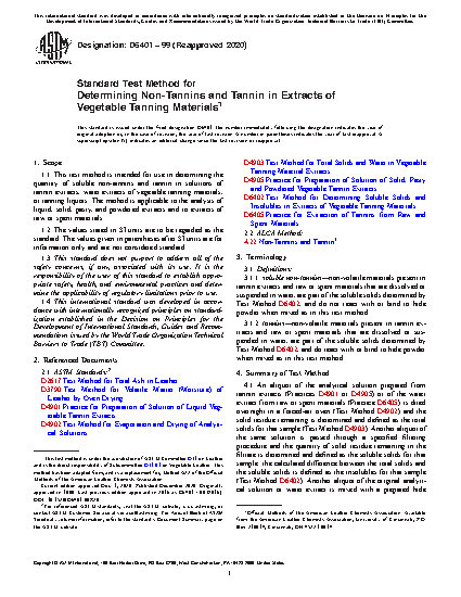1.1 This test method is intended for use in determining the quantity of soluble non-tannins and tannin in solutions of tannin extracts, water extracts of vegetable tanning materials, or tanning liquors. The method is applicable to the analysis of liquid, solid, pasty, and powdered extracts and to extracts of raw or spent materials.