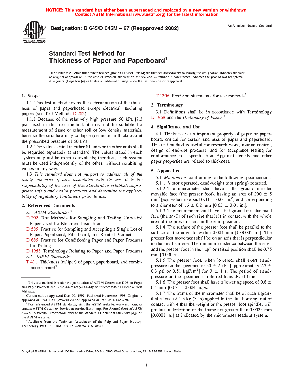 Thickness is an important property of paper or paperboard, critical for certain end uses of paper and paperboard. This test method is useful for research work, routine control, design of end-use products, and for acceptance testing for conformance to a specification. Apparent density and other paper properties are related to thickness.