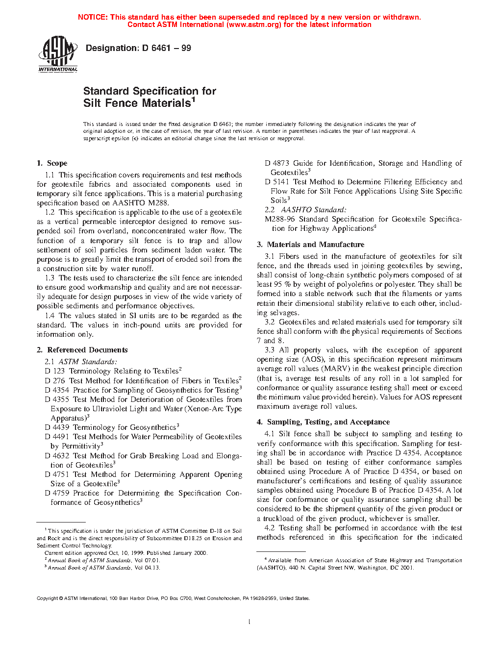 1.1 This specification covers requirements and test methods for geotextile fabrics and associated components used in temporary silt fence applications. This is a material purchasing specification based on AASHTO M288.