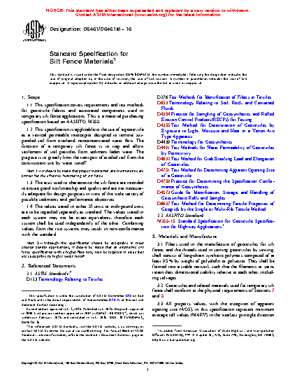 This specification covers requirements and test methods for geotextile fabrics and associated components used in temporary silt fence applications. It is applicable to the use of a geotextile as a vertical permeable interceptor designed to remove suspended soil from overland, nonconcentrated water flow. The function of a temporary silt fence is to trap and allow settlement of soil particles from sediment laden water. The purpose is to greatly limit the transport of eroded soil from the construction site by water runoff. Fibers used in the manufacture of geotextiles for silt fence, and the threads used in joining geotextiles by sewing, shall consist of long-chain synthetic polymers composed of at least 95 % by weight of polyolefins or polyester. They shall be formed into a stable network such that the filaments or yarns retain their dimensional stability relative to each other, including selvages. Geotextiles and related materials used for temporary silt fence shall conform with required grab strength, permittivity, apparent opening size, and ultraviolet stability. The prescribed support posts are described in the specification.