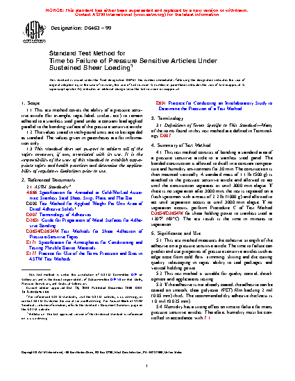 1.1 This test method covers the ability of a pressure sensitive article (for example, tape, label, sticker, etc.) to remain adhered to a stainless steel panel under a constant load applied parallel to the bonding surface of the pressure sensitive article.