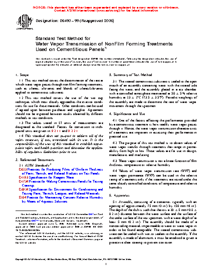 1.1 This test method covers the determination of the rate at which water vapor passes through non film forming treatments, such as silanes, siloxanes and blends of silanes/siloxanes applied to cementitious substrates.