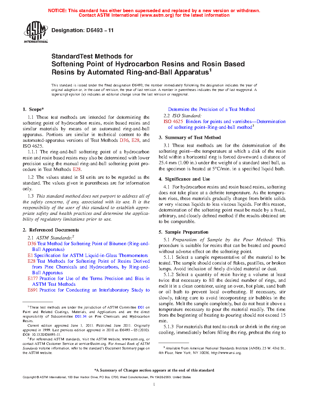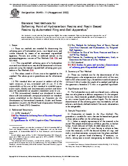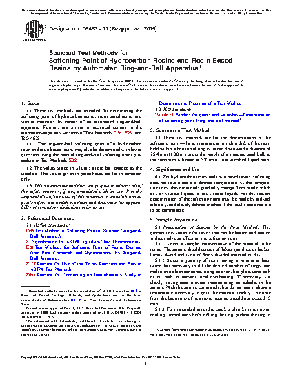 1.1 These test methods are intended for determining the softening point of hydrocarbon resins, rosin based resins and similar materials by means of an automated ring-and-ball apparatus. Portions are similar in technical content to the automated-apparatus versions of Test Methods D36, E28, and ISO 4625.