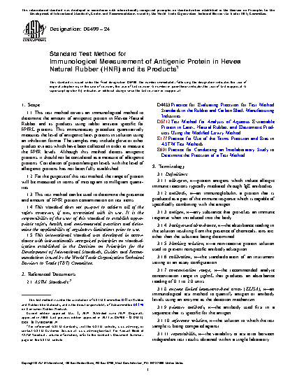 1.1 This test method covers an immunological method to determine the amount of antigenic protein in natural rubber and its products using rabbit antisera specific for natural rubber latex (NRL) proteins. This immunoassay procedure quantitatively measures the level of antigenic latex proteins in solution using an inhibition format. The samples may include glove or other rubber product extracts which have been collected in order to measure the latex protein levels. Although this method detects antigenic proteins, it should not be considered as a measure of allergenic proteins. Correlation of protein/antigen levels with the level of allergenic proteins has not been fully established.