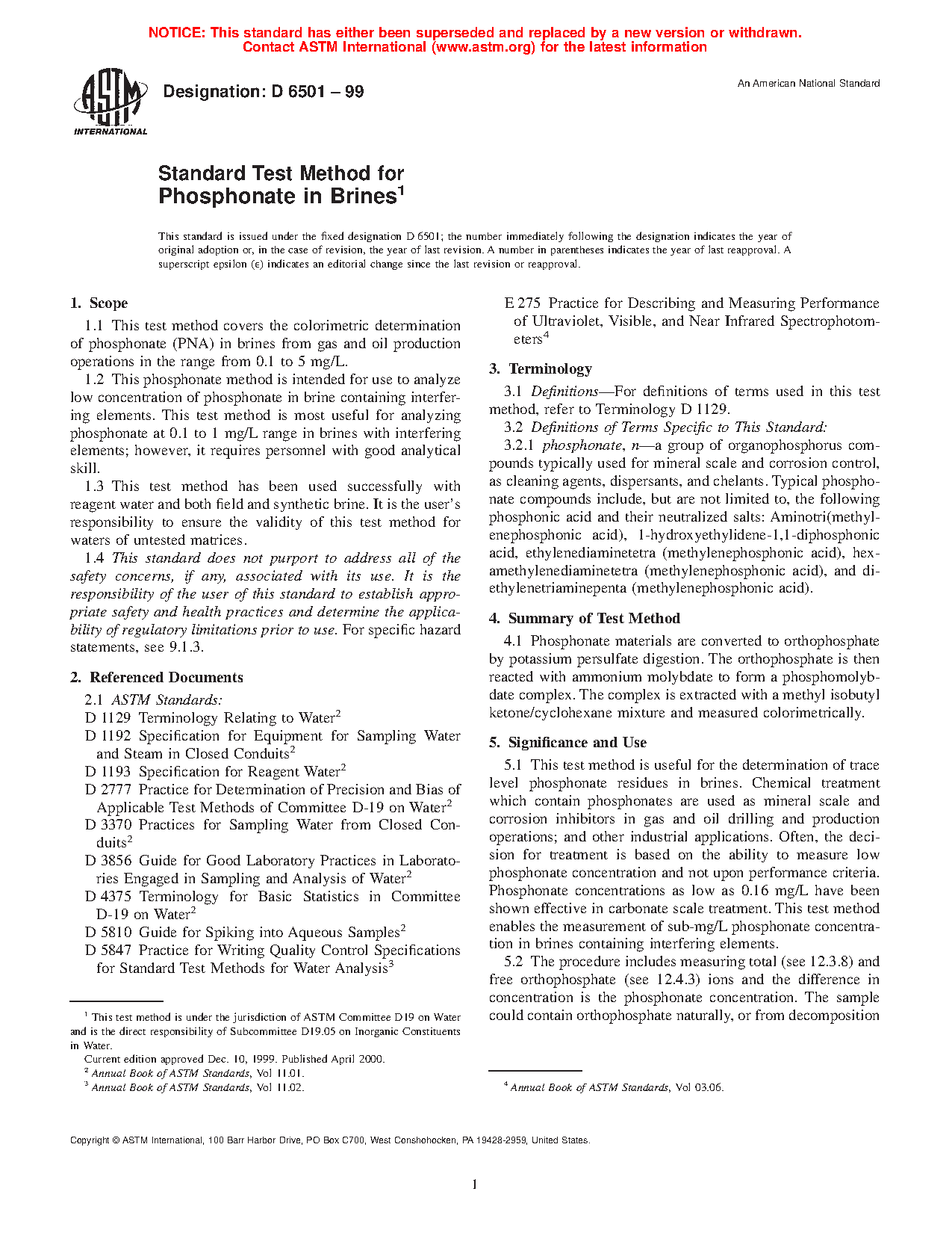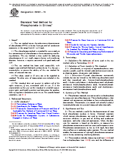 1.2 This phosphonate method is intended for use to analyze low concentration of phosphonate in brine containing interfering elements. This test method is most useful for analyzing phosphonate at 0.1 to 1 mg/L range in brines with interfering elements; however, it requires personnel with good analytical skill.
