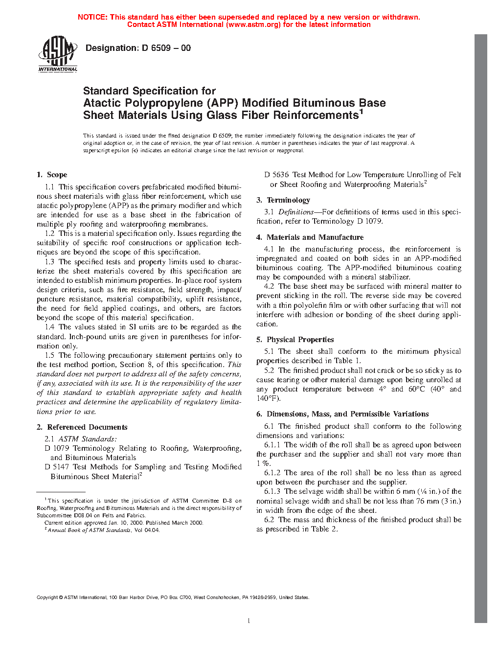 1.1 This specification covers prefabricated modified bituminous sheet materials with glass fiber reinforcement, which use atactic polypropylene (APP) as the primary modifier and which are intended for use as a base sheet in the fabrication of multiple ply roofing and waterproofing membranes.