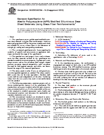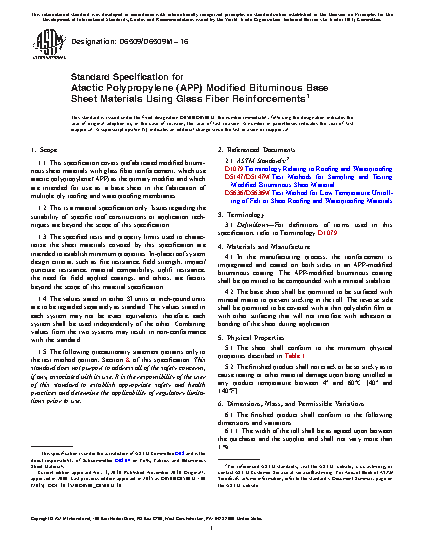 1.1 This specification covers prefabricated modified bituminous sheet materials with glass fiber reinforcement, which use atactic polypropylene (APP) as the primary modifier and which are intended for use as a base sheet in the fabrication of multiple ply roofing and waterproofing membranes.