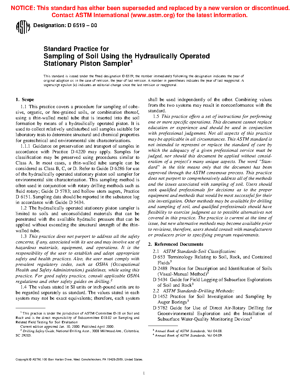 1.1.1 Guidance on preservation and transport of samples in accordance with Practice D4220 may apply. Samples for classification may be preserved using procedures similar to Class A. In most cases, a thin-walled tube sample can be considered as Class B, C, or D. Refer to Guide D6169 for use of the hydraulically operated stationary piston soil sampler for environmental site characterization. This sampling method is often used in conjunction with rotary drilling methods such as fluid rotary; Guide D5783; and hollow stem augers, Practice D6151. Sampling data should be reported in the field log in accordance with Guide D5434.