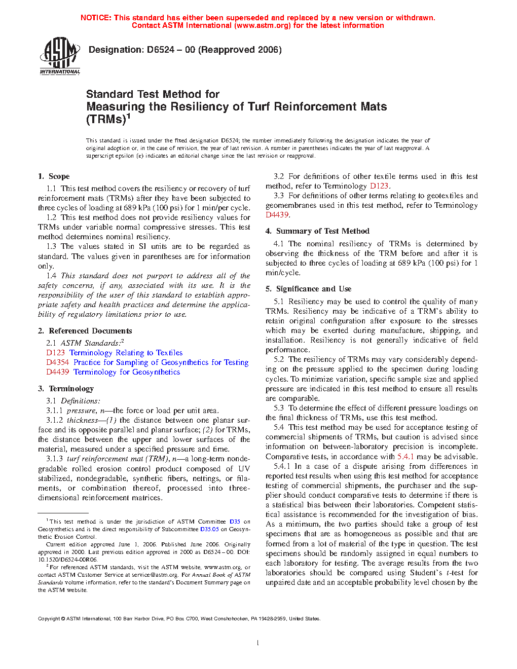 1.3 This test method does not provide resiliency values for TRMs under variable normal compressive stresses. This test method determines nominal resiliency.
