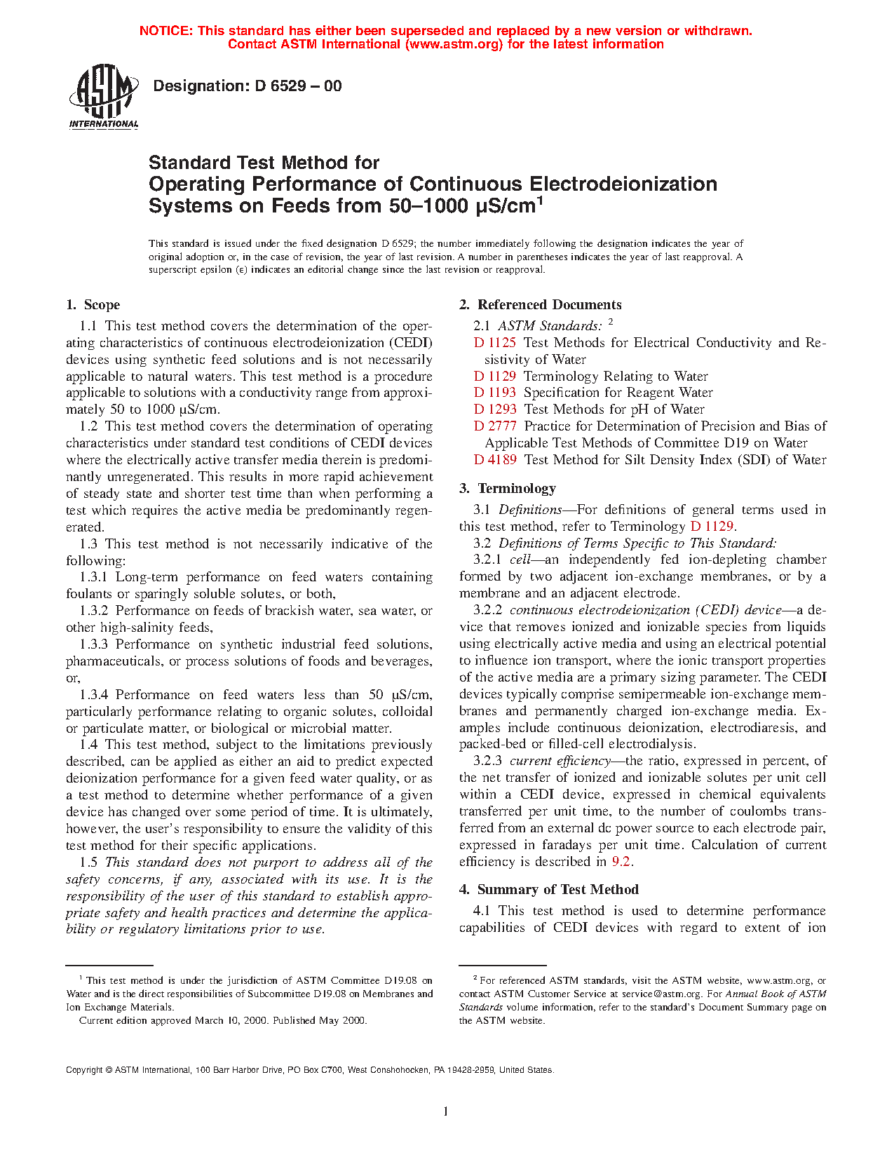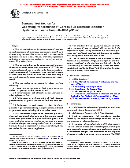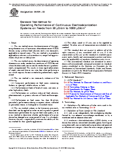 1.1 This test method covers the determination of the operating characteristics of continuous electrodeionization (CEDI) devices using synthetic feed solutions and is not necessarily applicable to natural waters. This test method is a procedure applicable to solutions with a conductivity range from approximately 50 to 1000 S/cm.