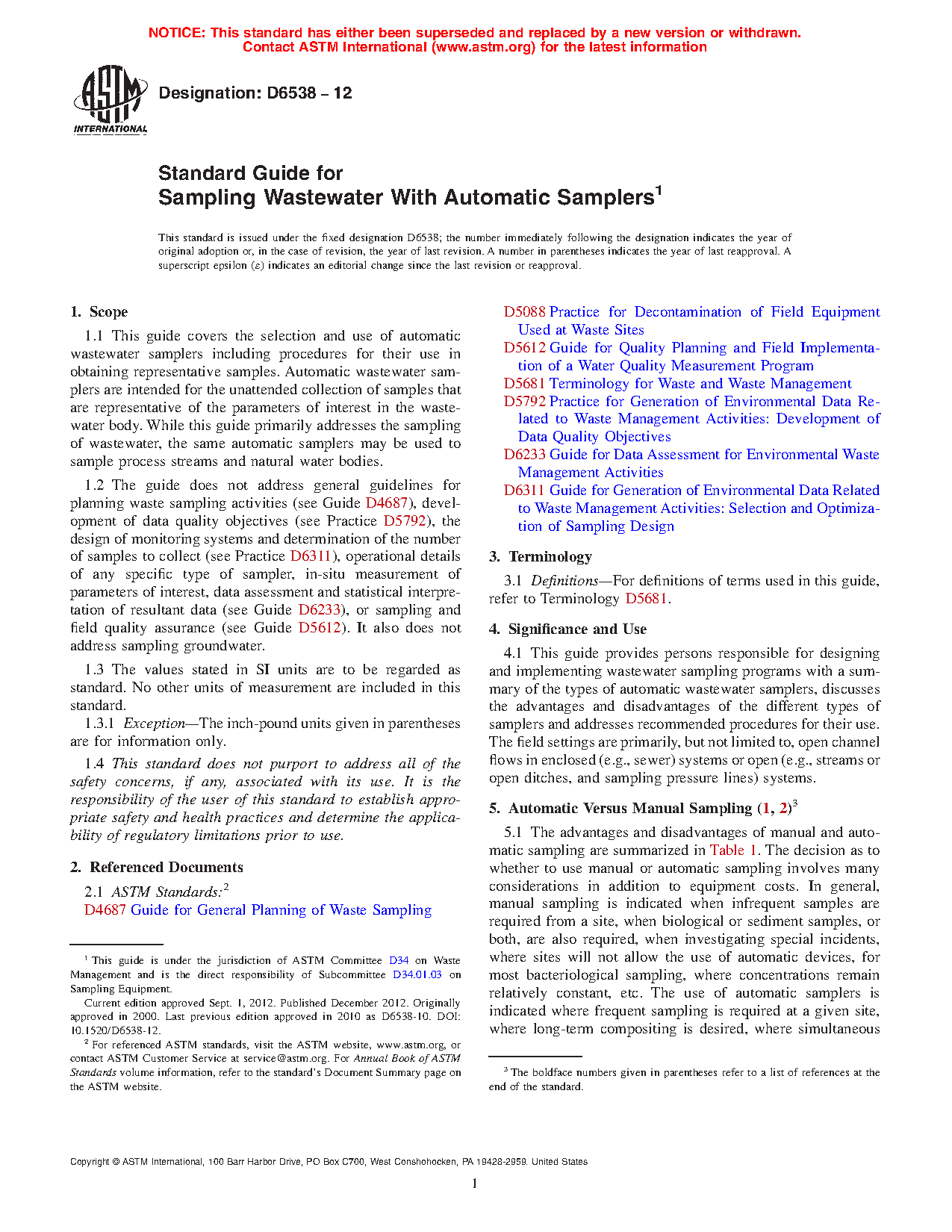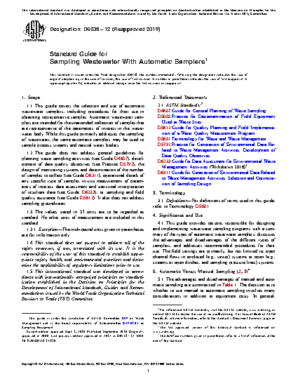 1.1 This guide covers the selection and use of automatic wastewater samplers, including procedures for their use in obtaining representative samples. Automatic wastewater samplers are intended for the unattended collection of samples that are representative of the parameters of interest in the wastewater body. While this guide primarily addresses the sampling of wastewater, the same automatic samplers may be used to sample process streams and natural water bodies.