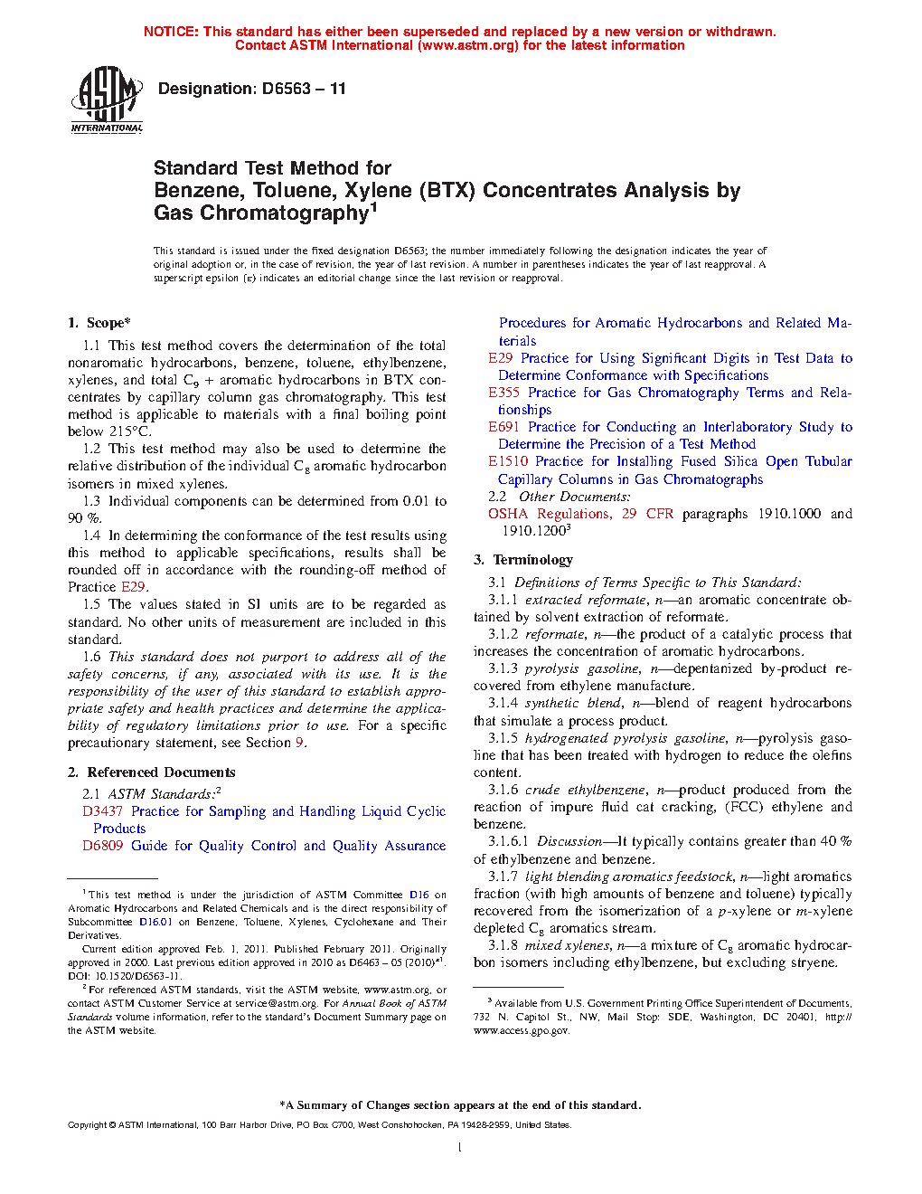 1.1 This test method covers the determination of the total nonaromatic hydrocarbons, benzene, toluene, ethylbenzene, xylenes, and total C9 + aromatic hydrocarbons in BTX concentrates by capillary column gas chromatography. This test method is applicable to materials with a final boiling point below 215°C.