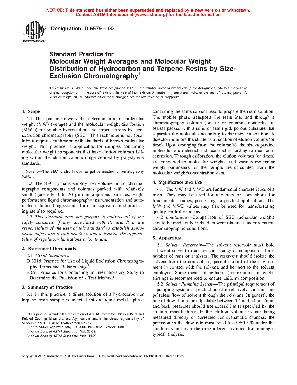 1.1 This practice covers the determination of apparent molecular weight (MW) averages and molecular weight distributions (MWD) for THF-soluble hydrocarbon, rosin and terpene resins by size-exclusion chromatography (SEC). This technique is not absolute; it requires calibration with standards of known molecular weight. This practice is applicable to resins containing molecular-weight components that have elution volumes falling within the elution volume range defined by polystyrene standards.