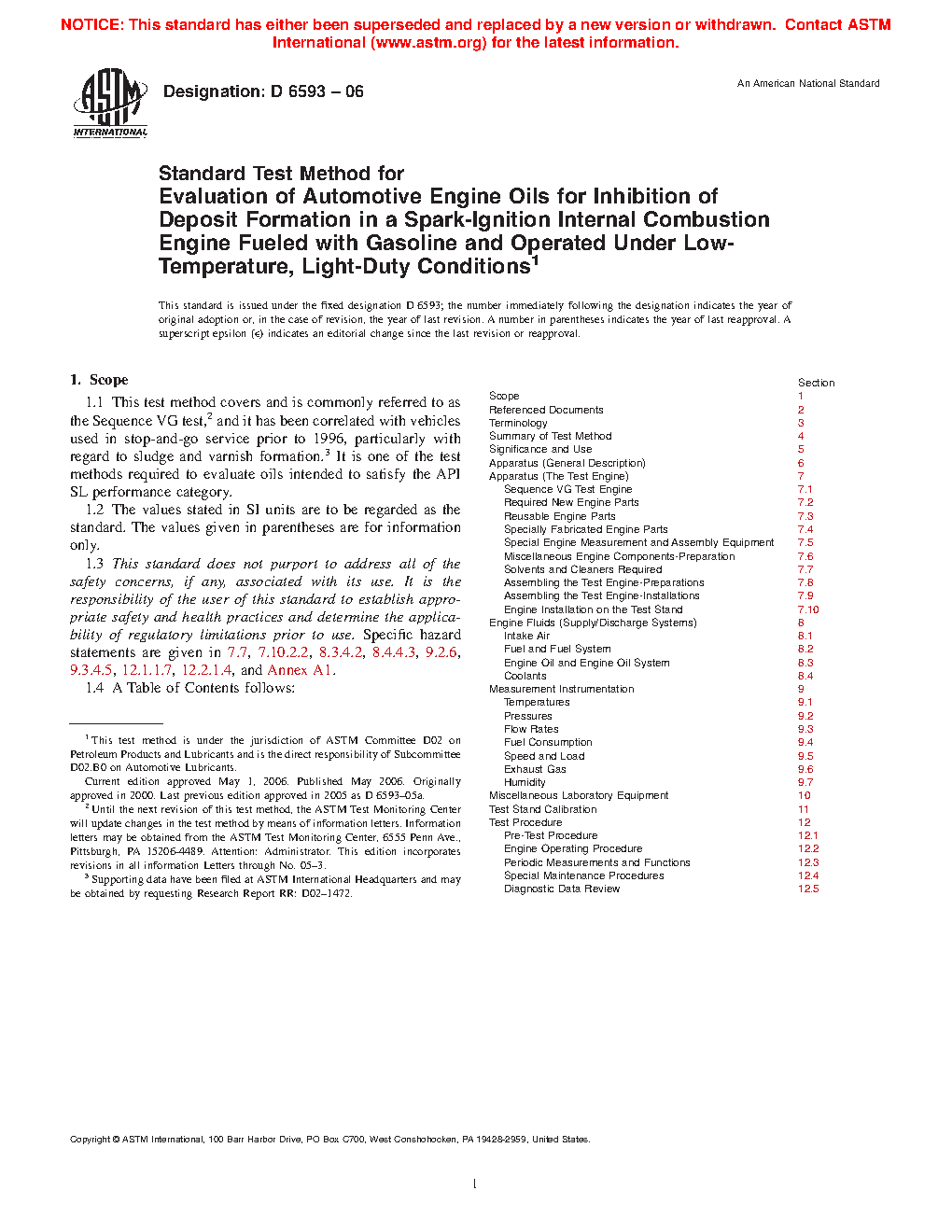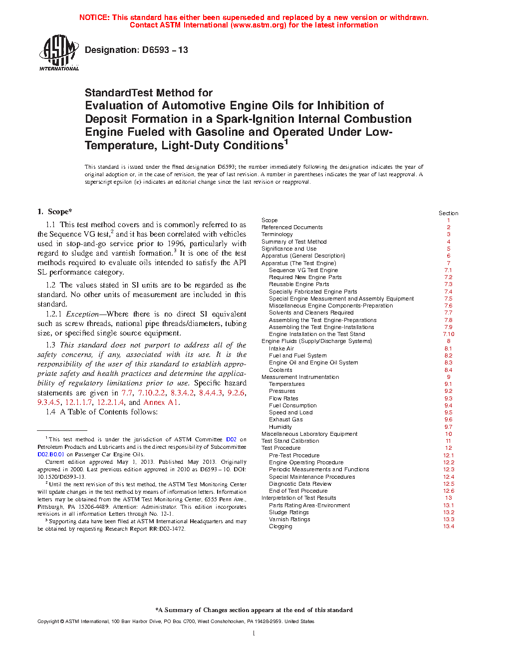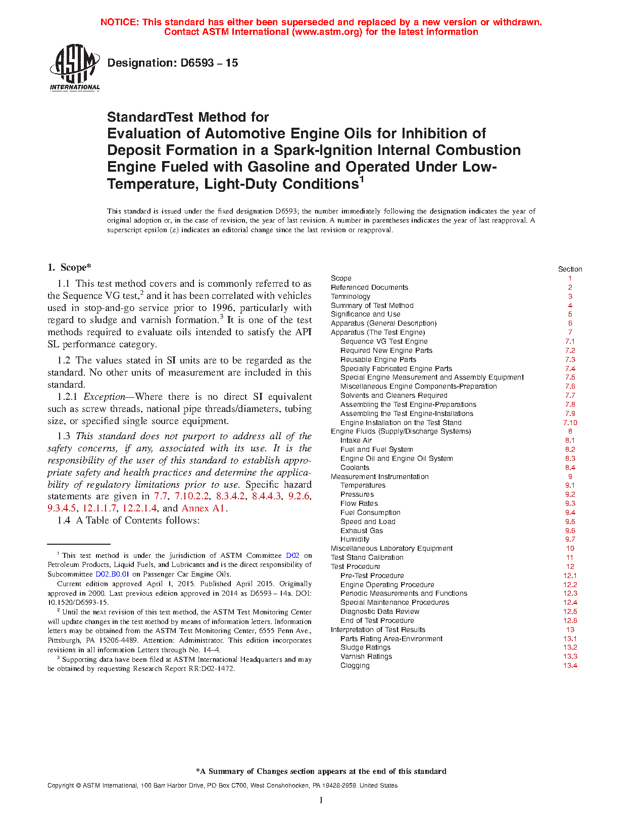 1.1 This test method is commonly referred to as the Sequence VG test and has been correlated with vehicles used in stop-and-go service prior to 1996, particularly with regard to sludge and varnish formation. It is one of the test methods required to evaluate oils intended to satisfy the API SL performance category.