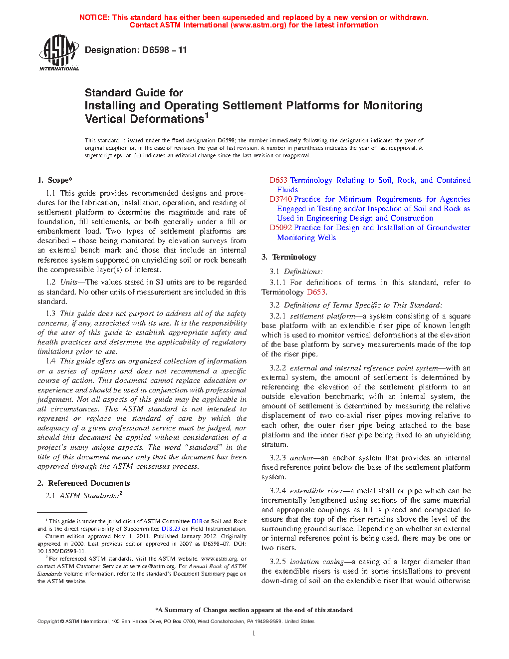 1.1 This guide provides recommended designs and procedures for the fabrication, installation, operation, and reading of settlement platform to determine the magnitude and rate of foundation, fill settlements, or both generally under a fill or embankment load. Two types of settlement platforms are described - those be monitored by elevation surveys from an external bench mark and those that include an internal reference system supported on unyielding soil or rock beneath the compressible layer(s) of interest.