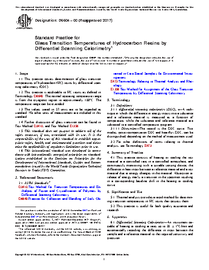 1.1 This practice covers determination of glass transition temperatures of hydrocarbon (HC) resins by differential scanning calorimetry (DSC).