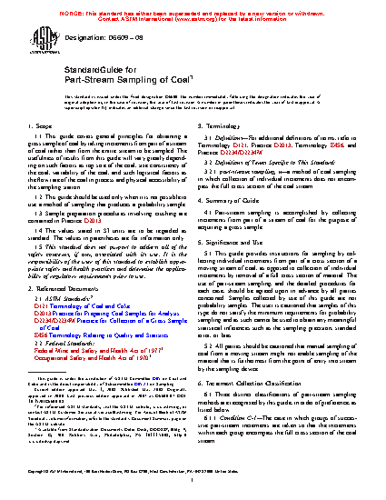 1.1 This guide covers general principles for obtaining a gross sample of coal by taking increments from part of a stream of coal rather than from the entire stream to be sampled. The usefulness of results from this guide will vary greatly depending on such factors as top size of the coal, size consistency of the coal, variability of the coal, and such logistical factors as the flow rate of the coal in process and physical accessibility of the sampling station.