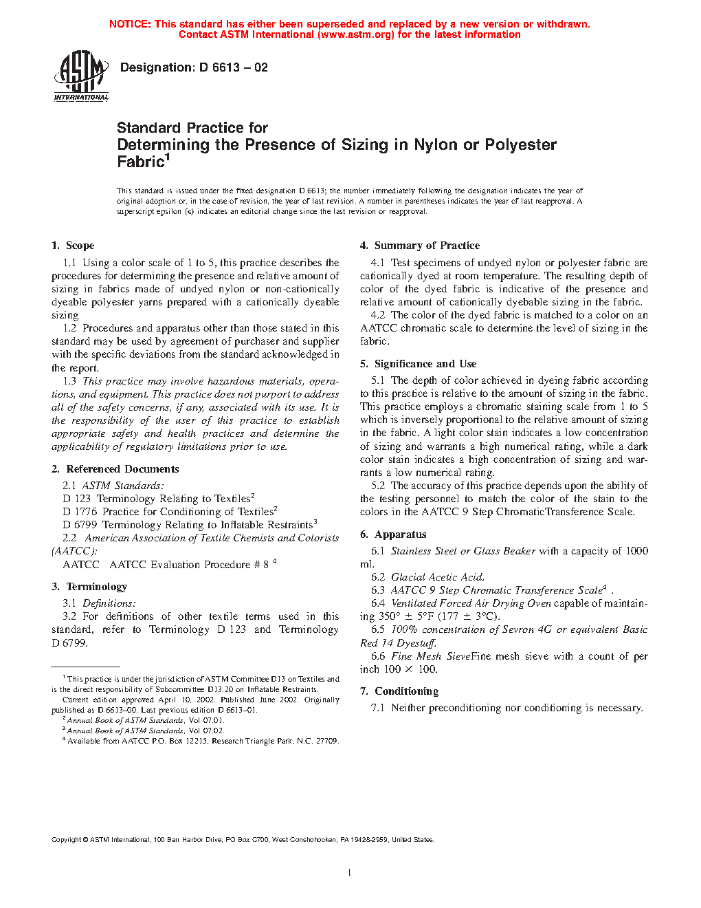 1.1 Using a color scale of 1 to 5, this practice describes the procedures for determining the presence and relative amount of sizing in fabrics made of undyed nylon or non-cationically dyeable polyester yarns prepared with a cationically dyeable sizing
