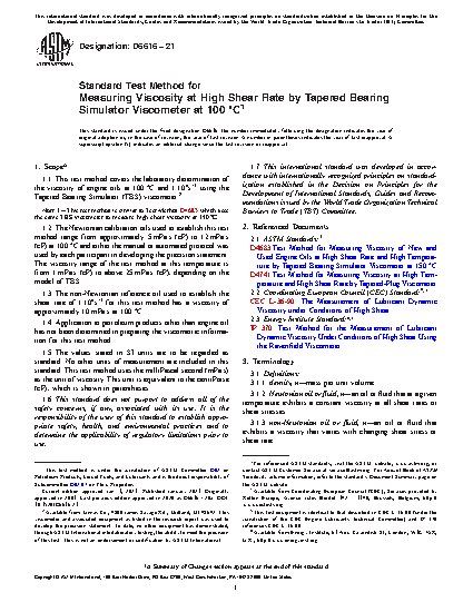 1.1 This test method covers the laboratory determination of the viscosity of engine oils at 100 °C and 1·106s–1 using the Tapered Bearing Simulator (TBS) viscometer.2