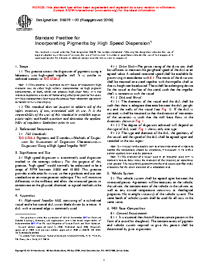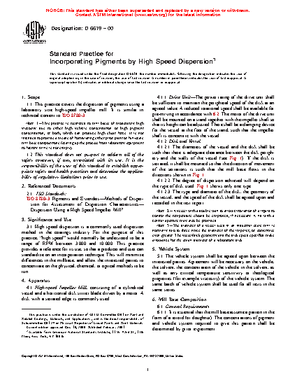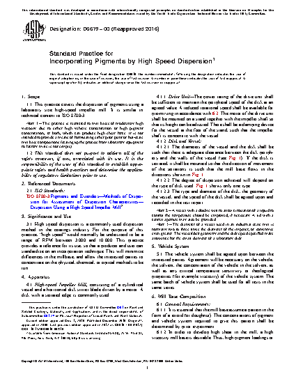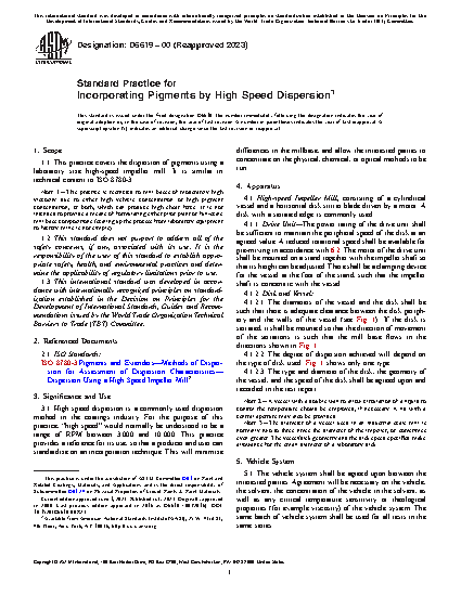 1.1 This practice covers the dispersion of pigments using a laboratory size high-speed impeller mill. It is similar in technical content to ISO 8780-3.