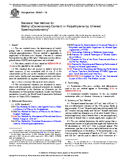 1.1 This test method covers the determination of methyl groups (that is, comonomer content) in polyethylenes by infrared spectrophotometry. The test method is applicable to copolymers of ethylene with 1-butene, 1-hexene, or 1-octene having densities above 900 kg/m3. High-pressure low-density polyethylenes (LDPE) and terpolymers are excluded.