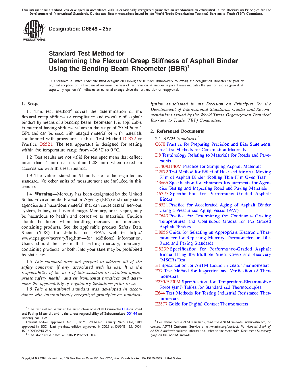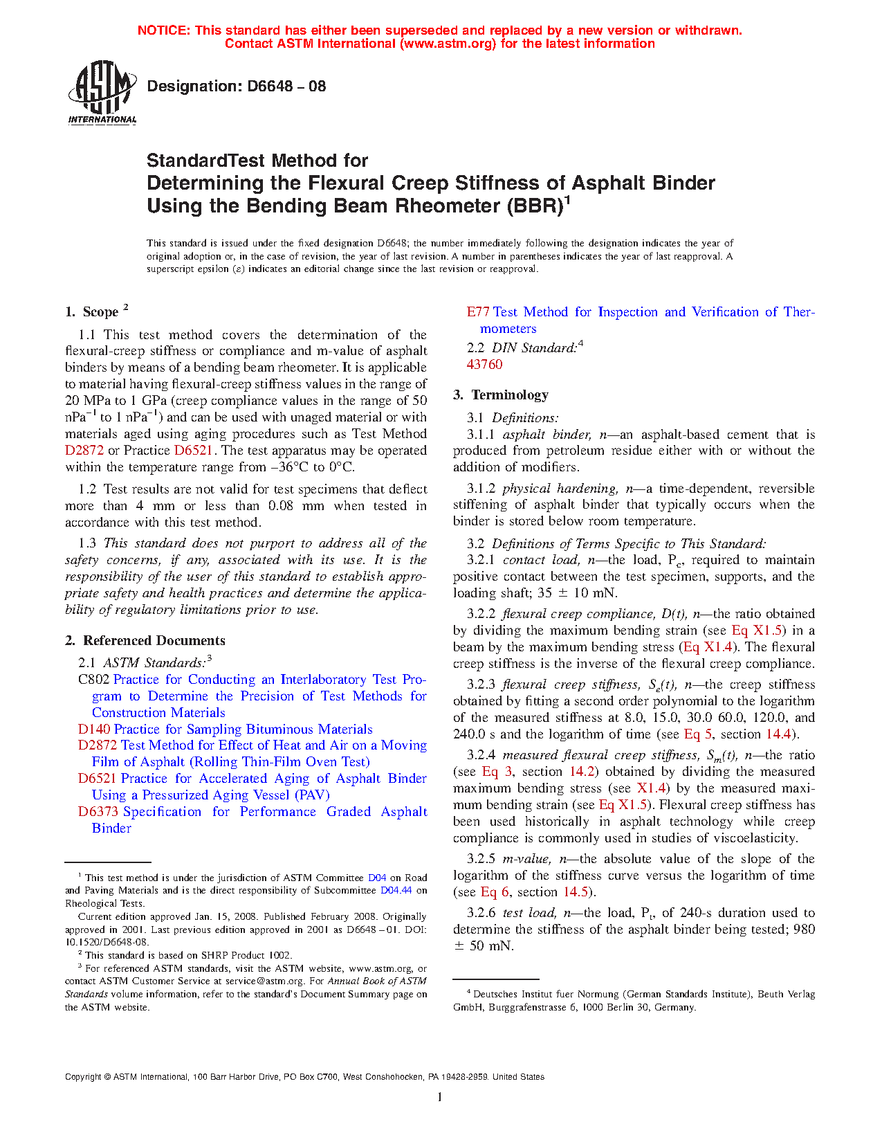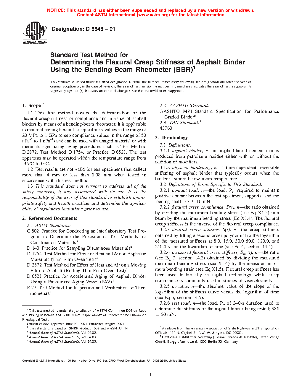 1.1 This test method covers the determination of the flexural-creep stiffness or compliance and m-value of asphalt binders by means of a bending beam rheometer. It is applicable to material having flexural-creep stiffness values in the range of 20 MPa to 1 GPa (creep compliance values in the range of 50 nPa–1 to 1 nPa–1) and can be used with unaged material or with materials aged using aging procedures such as Test Method D2872 or Practice D6521. The test apparatus may be operated within the temperature range from –36°C to 0°C.