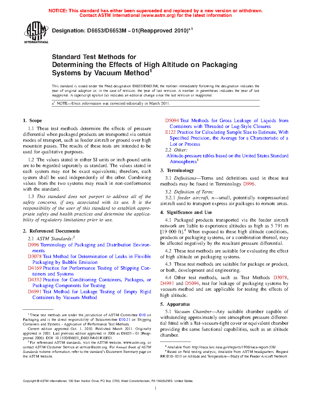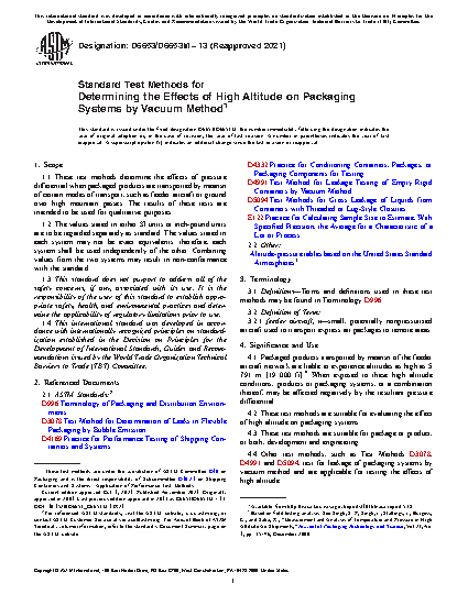 4.4 Other test methods, such as Test Methods D3078, D4991 and D5094, test for leakage of packaging systems by vacuum method and are applicable for testing the effects of high altitude.