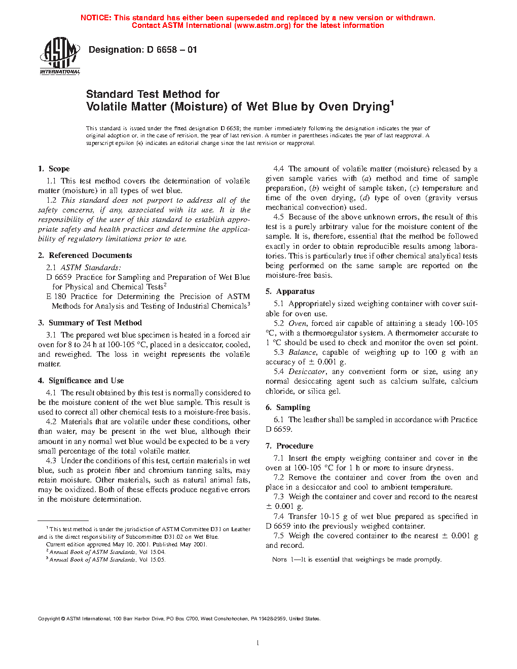 4.1 The result obtained by this test is normally considered to be the moisture content of the wet blue or wet white sample. This result is used to correct all other chemical tests to a moisture-free basis.
