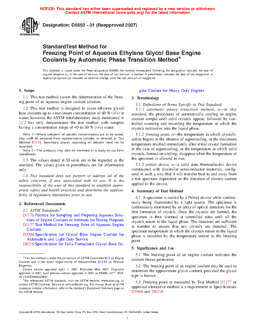 1.2 This test method is designed to cover ethylene glycol base coolants up to a maximum concentration of 60 % (v/v) in water; however, the ASTM interlaboratory study mentioned in has only demonstrated the test method with samples having a concentration range of 40 to 60 % (v/v) water.