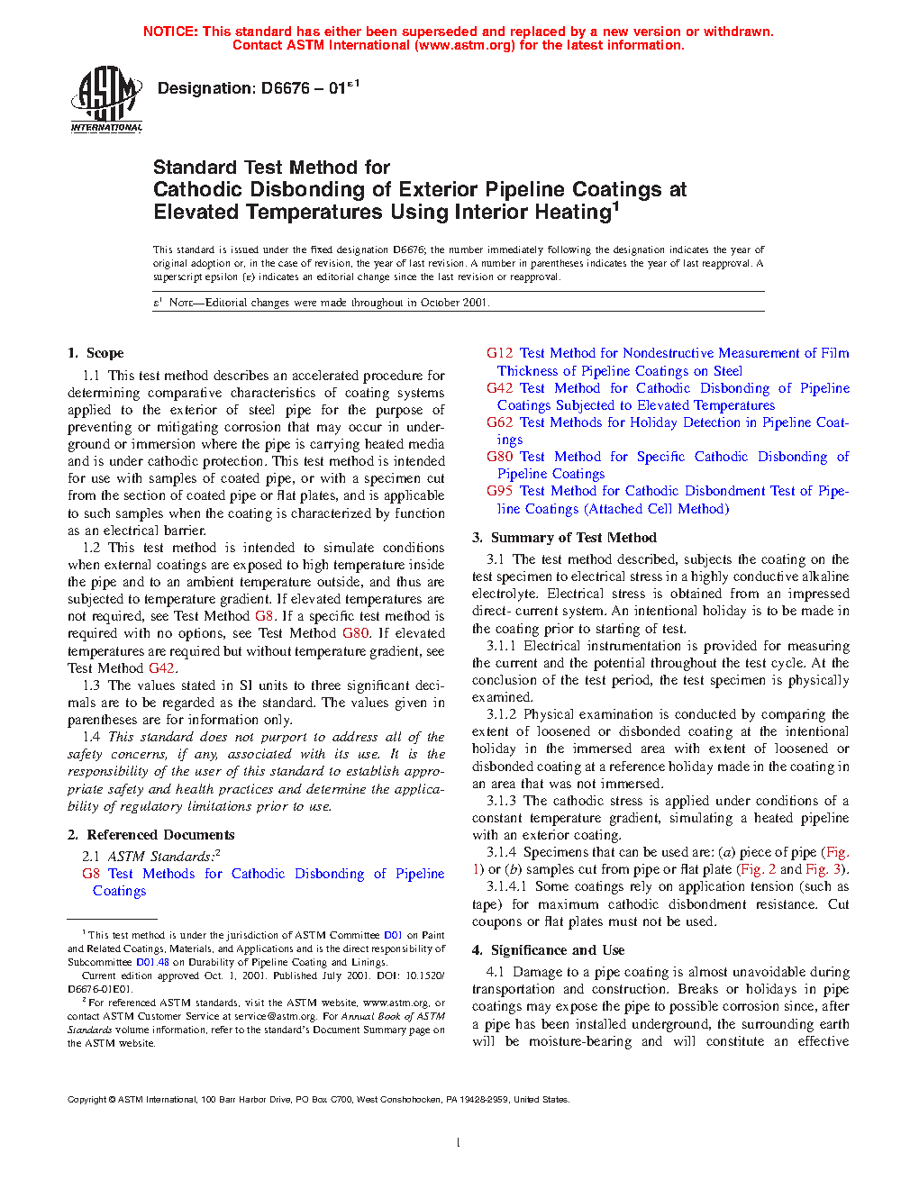 1.1 This test method describes an accelerated procedure for determining comparative characteristics of coating systems applied to the exterior of steel pipe for the purpose of preventing or mitigating corrosion that may occur in underground or immersion where the pipe is carrying heated media and is under cathodic protection. This test method is intended for use with samples of coated pipe, or with a specimen cut from the section of coated pipe or flat plates, and is applicable to such samples when the coating is characterized by function as an electrical barrier.