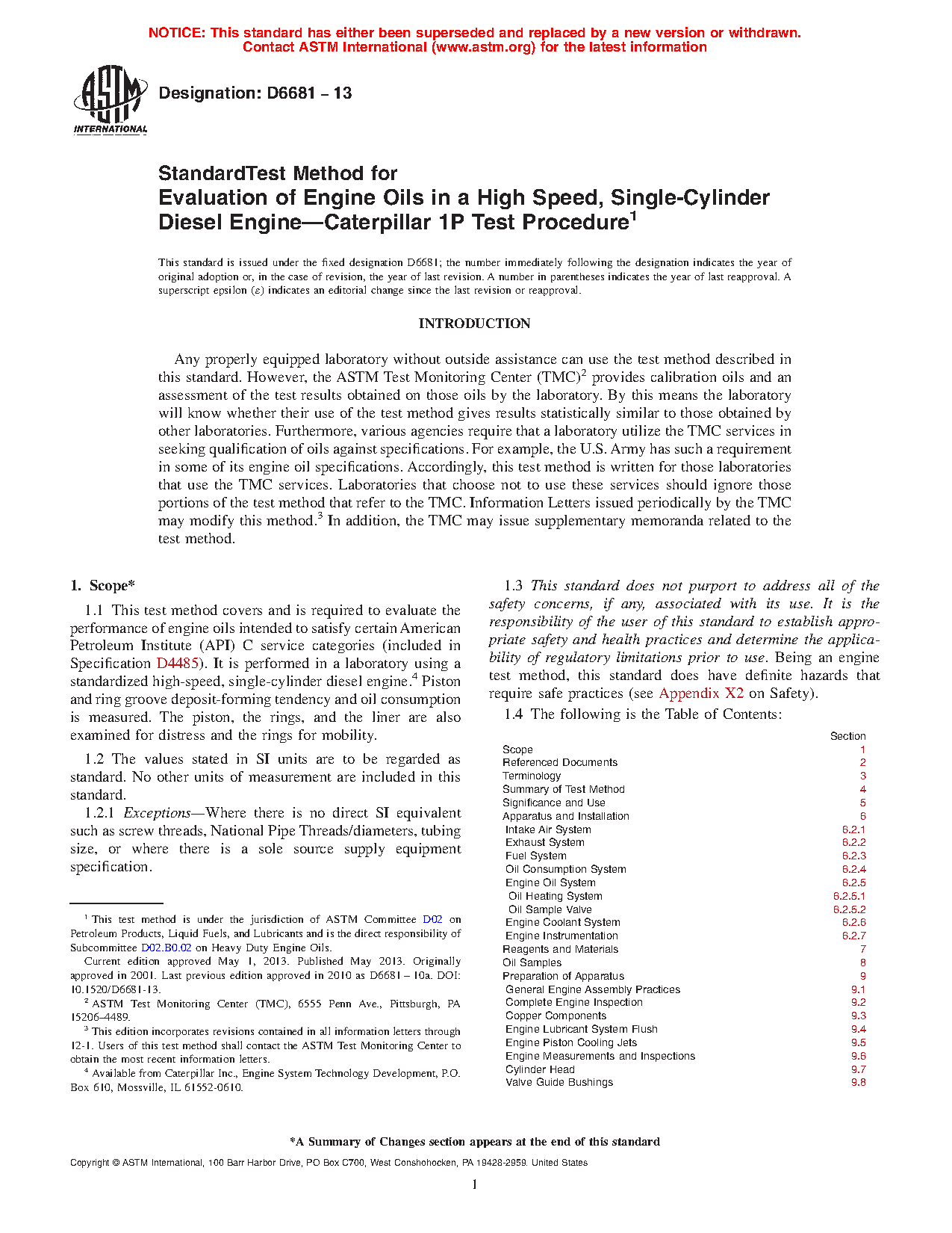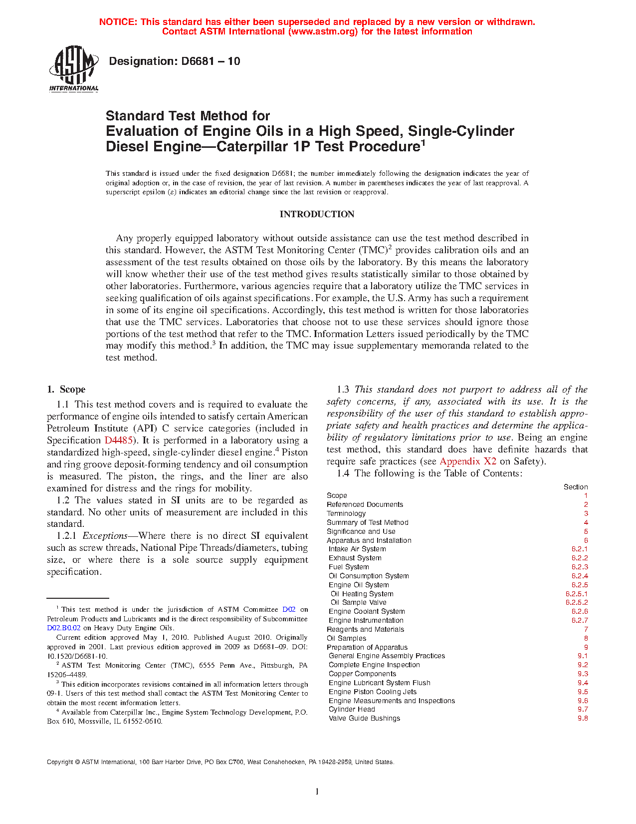 1.1 This test method covers and is required to evaluate the performance of engine oils intended to satisfy certain American Petroleum Institute (API) C service categories (included in Specification D4485). It is performed in a laboratory using a standardized high-speed, single-cylinder diesel engine.4 Piston and ring groove deposit-forming tendency and oil consumption is measured. The piston, the rings, and the liner are also examined for distress and the rings for mobility.